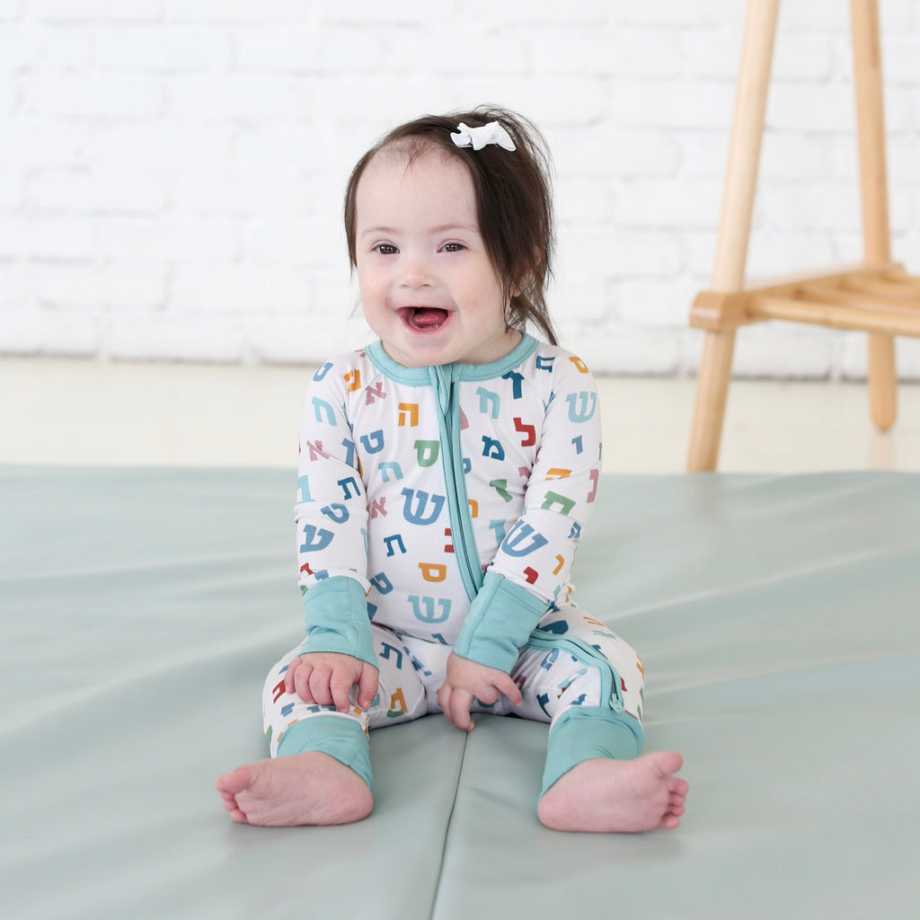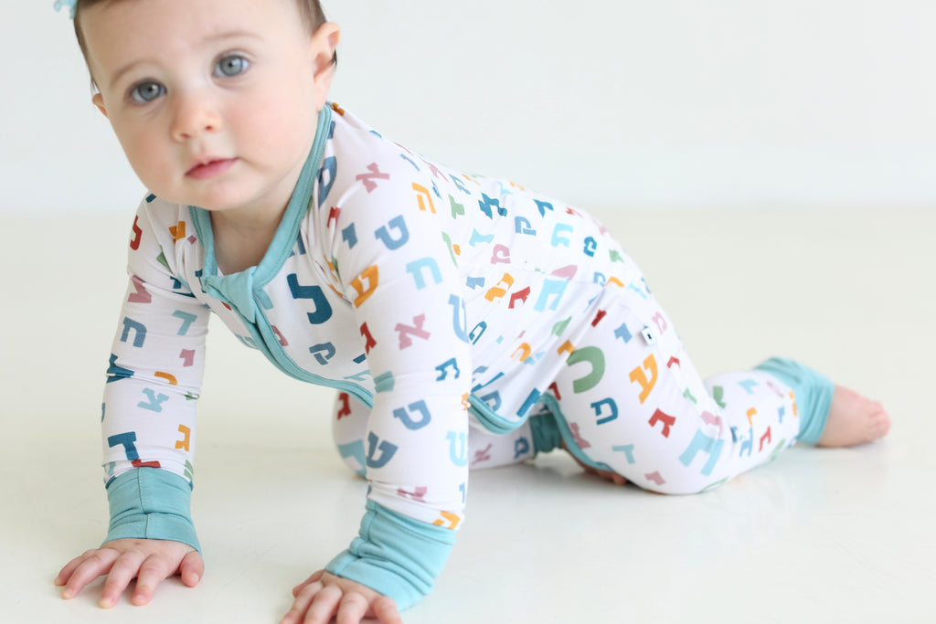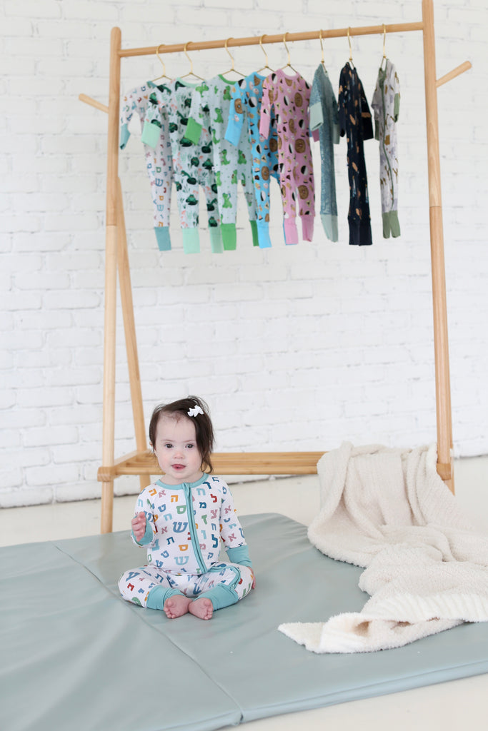 Our Aleph Bet Zippy pajama features a vibrant mix of colorful Hebrew letters, bringing the beauty of the aleph-bet to life. The bold, playful design makes learning and recognizing Hebrew letters part of the everyday routine. It’s a joyful way to connect with language, culture, and identity.