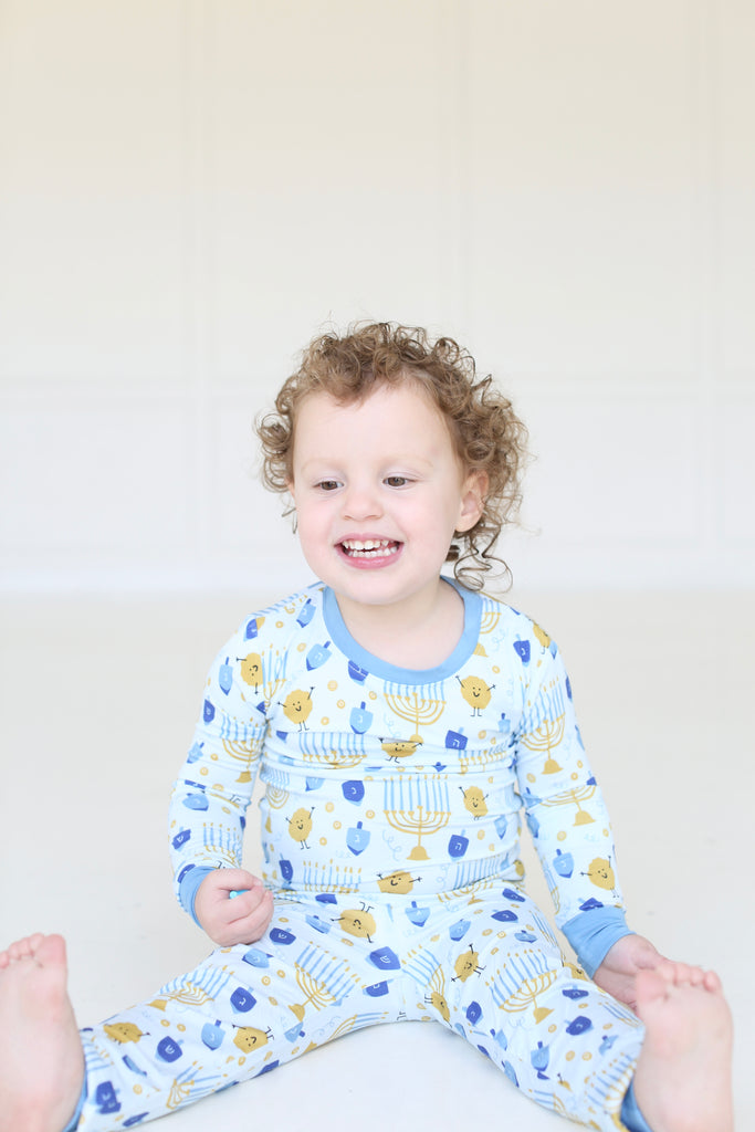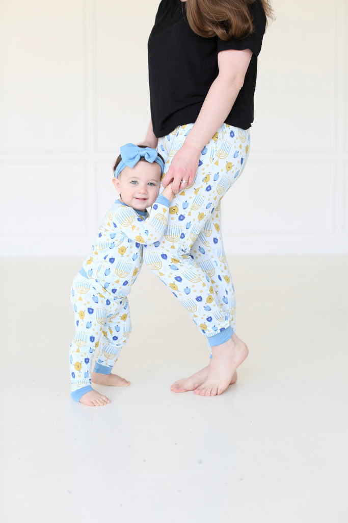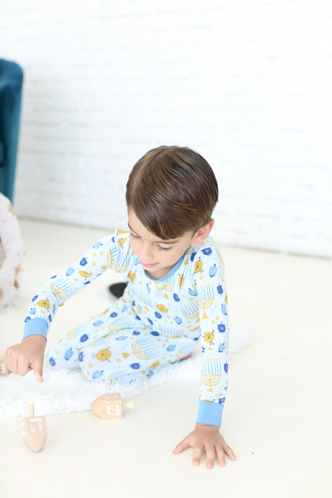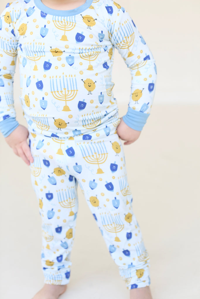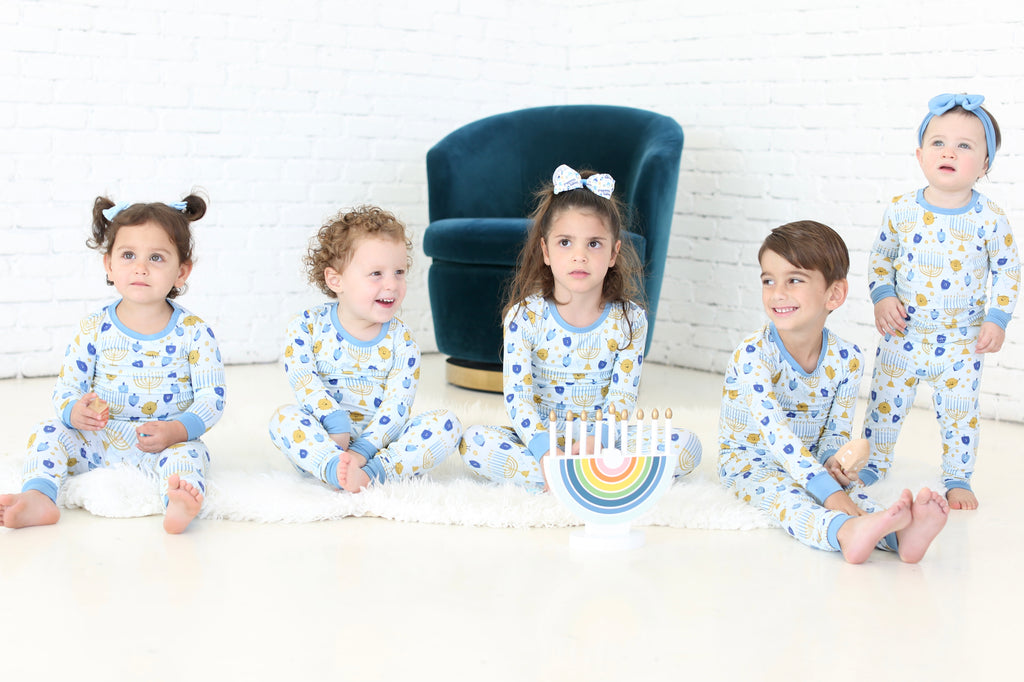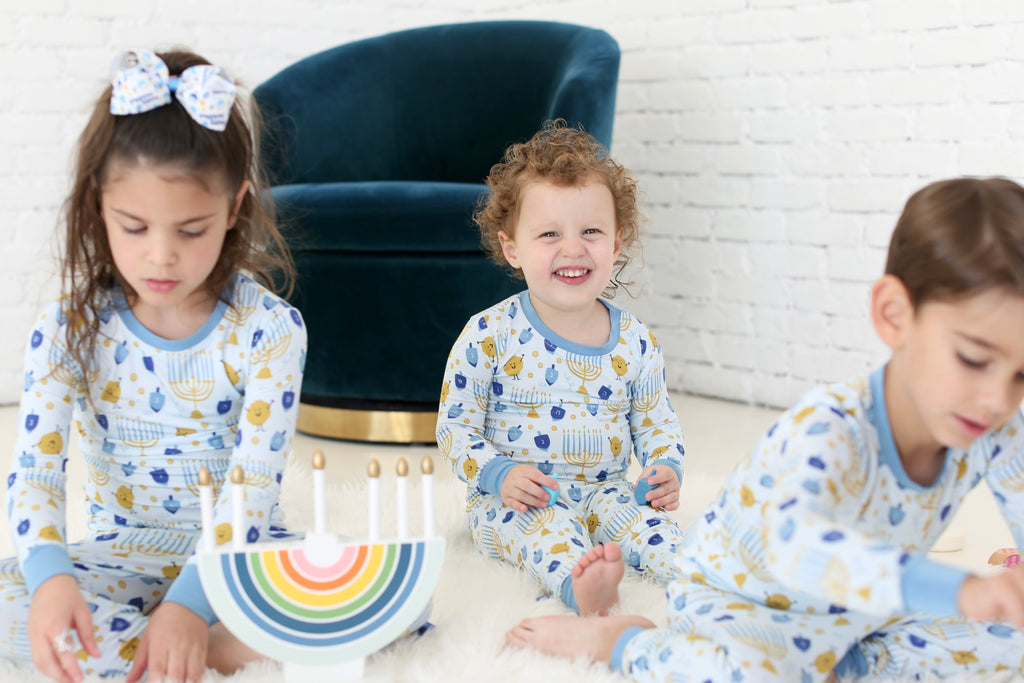 Designed in cozy shades of blue and sprinkled with all the holiday’s iconic symbols—dreidels, menorahs, gelt, and even our playful Latke Man—this pajama set is as festive as it is comfortable. Perfect for lighting candles, spinning dreidels, and snuggling up after the celebrations, it’s a fun and meaningful way to mark the season. Add it into your nightly lineup for a complete set of Hanukkah pajamas, and make each evening feel special.