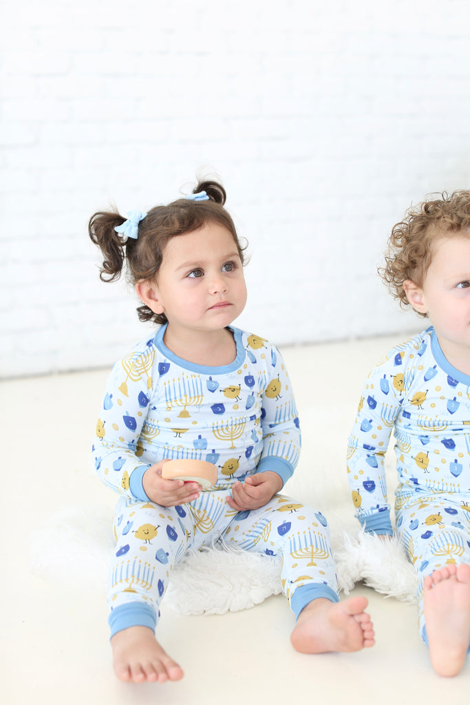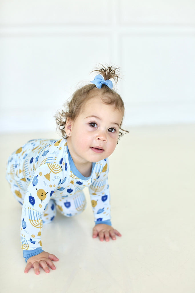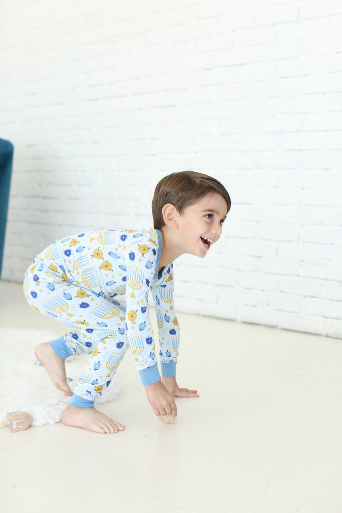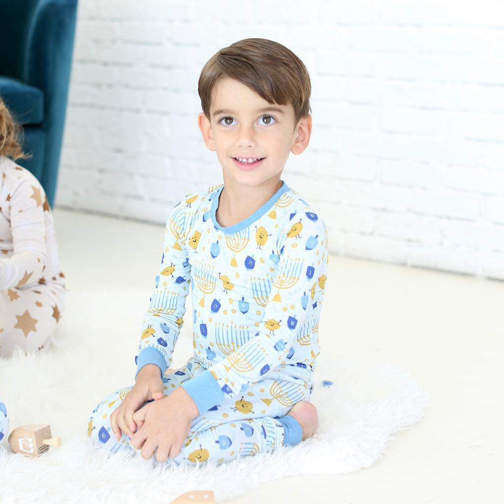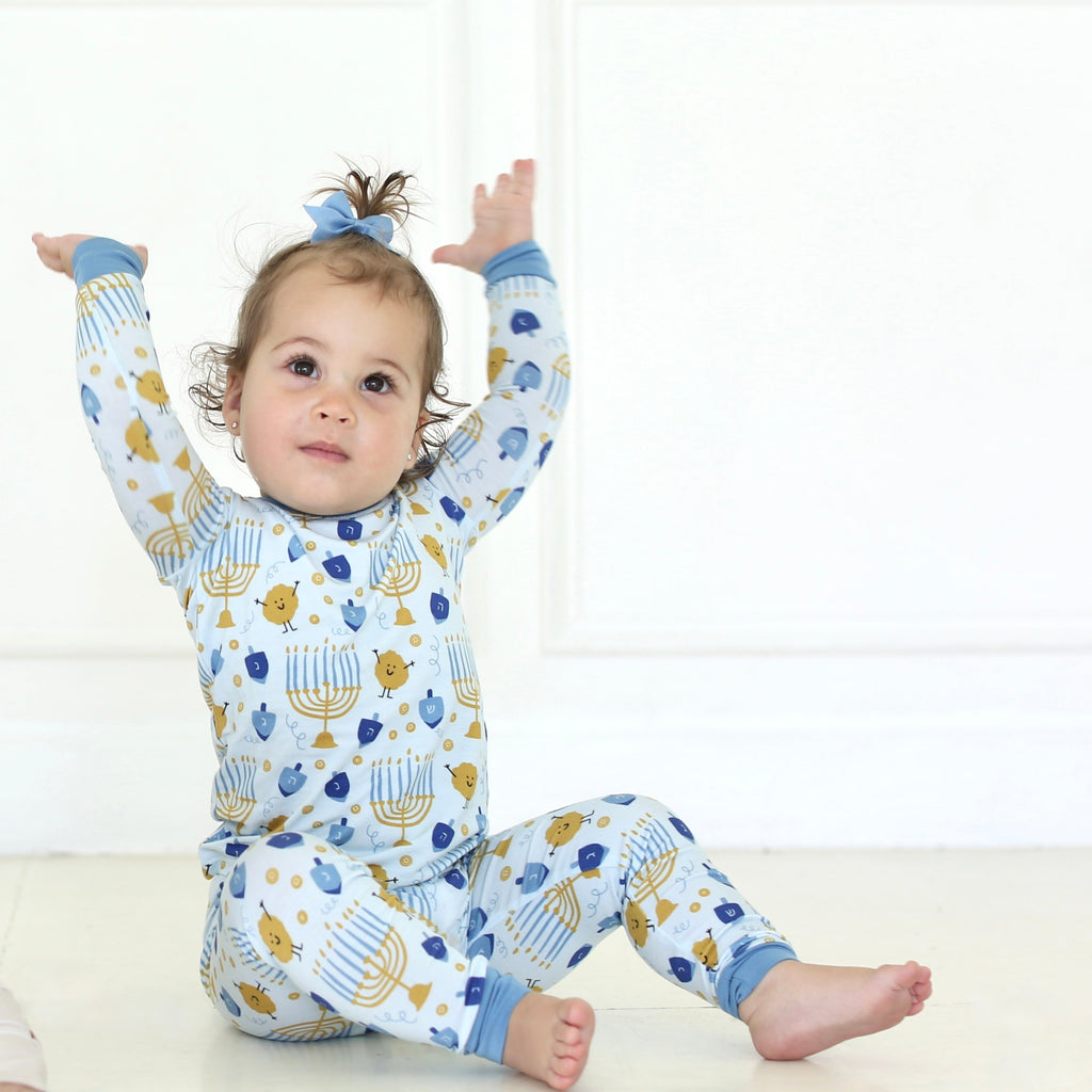 Designed in cozy shades of blue and sprinkled with all the holiday’s iconic symbols—dreidels, menorahs, gelt, and even our playful Latke Man—this pajama set is as festive as it is comfortable. Perfect for lighting candles, spinning dreidels, and snuggling up after the celebrations, it’s a fun and meaningful way to mark the season. Add it into your nightly lineup for a complete set of Hanukkah pajamas, and make each evening feel special.