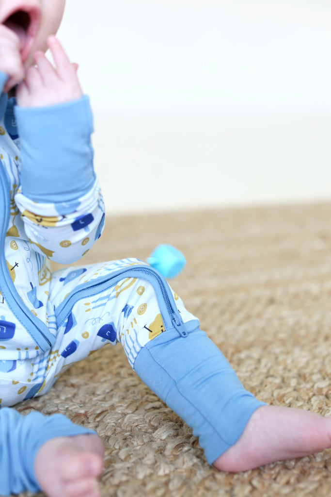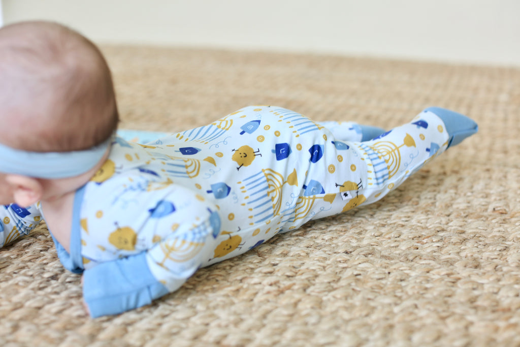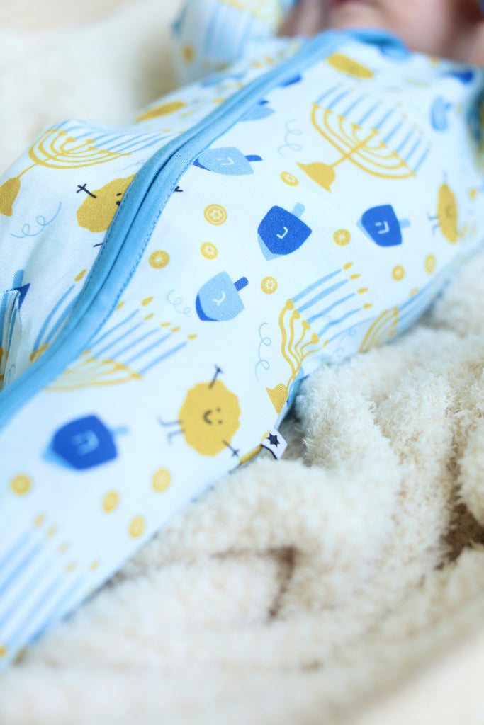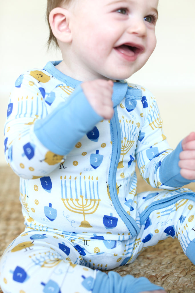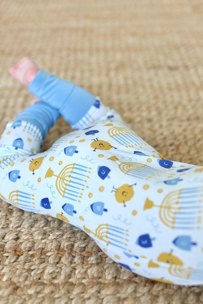 Designed in cozy shades of blue and sprinkled with all the holiday’s iconic symbols—dreidels, menorahs, gelt, and even our playful Latke Man—this pajama set is as festive as it is comfortable. Perfect for lighting candles, spinning dreidels, and snuggling up after the celebrations, it’s a fun and meaningful way to mark the season. Add it into your nightly lineup for a complete set of Hanukkah pajamas, and make each evening feel special.